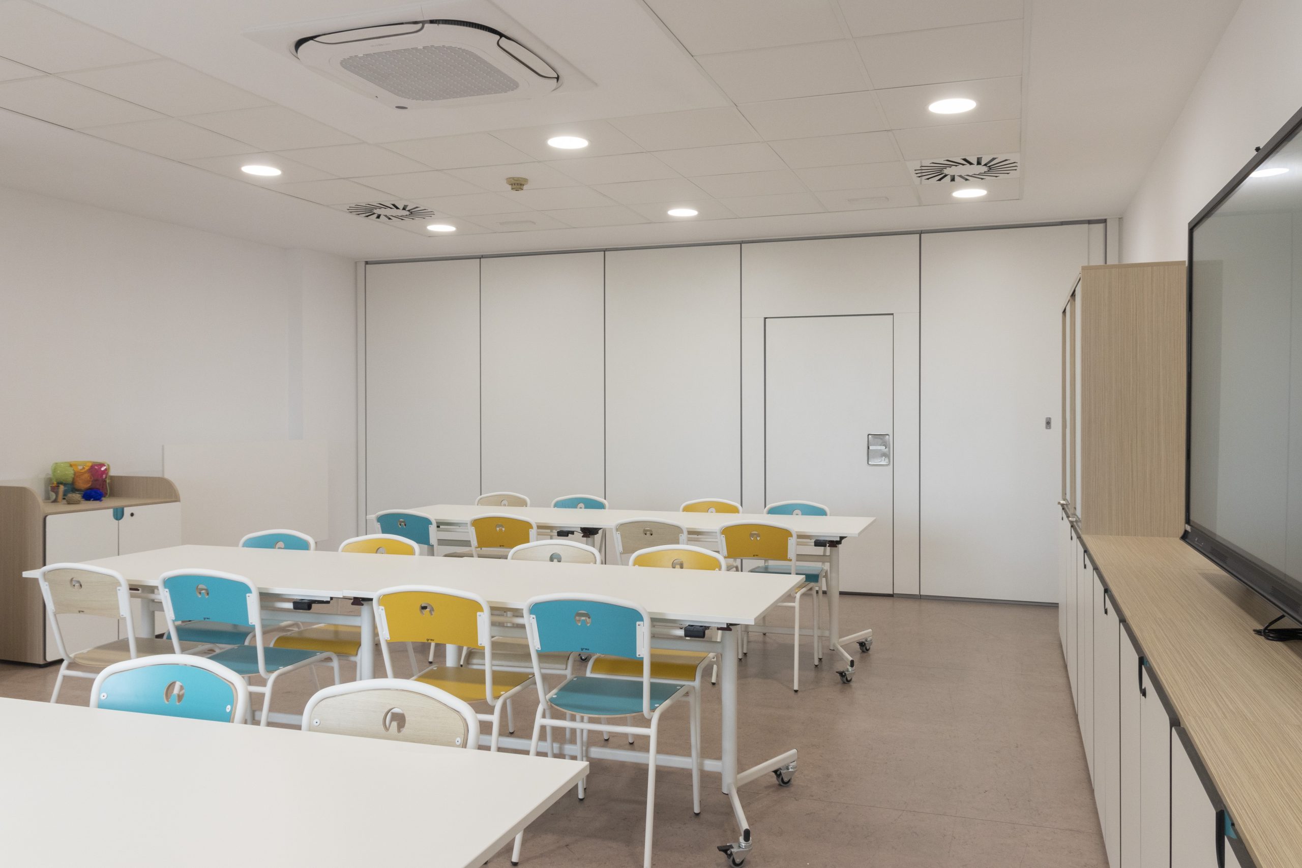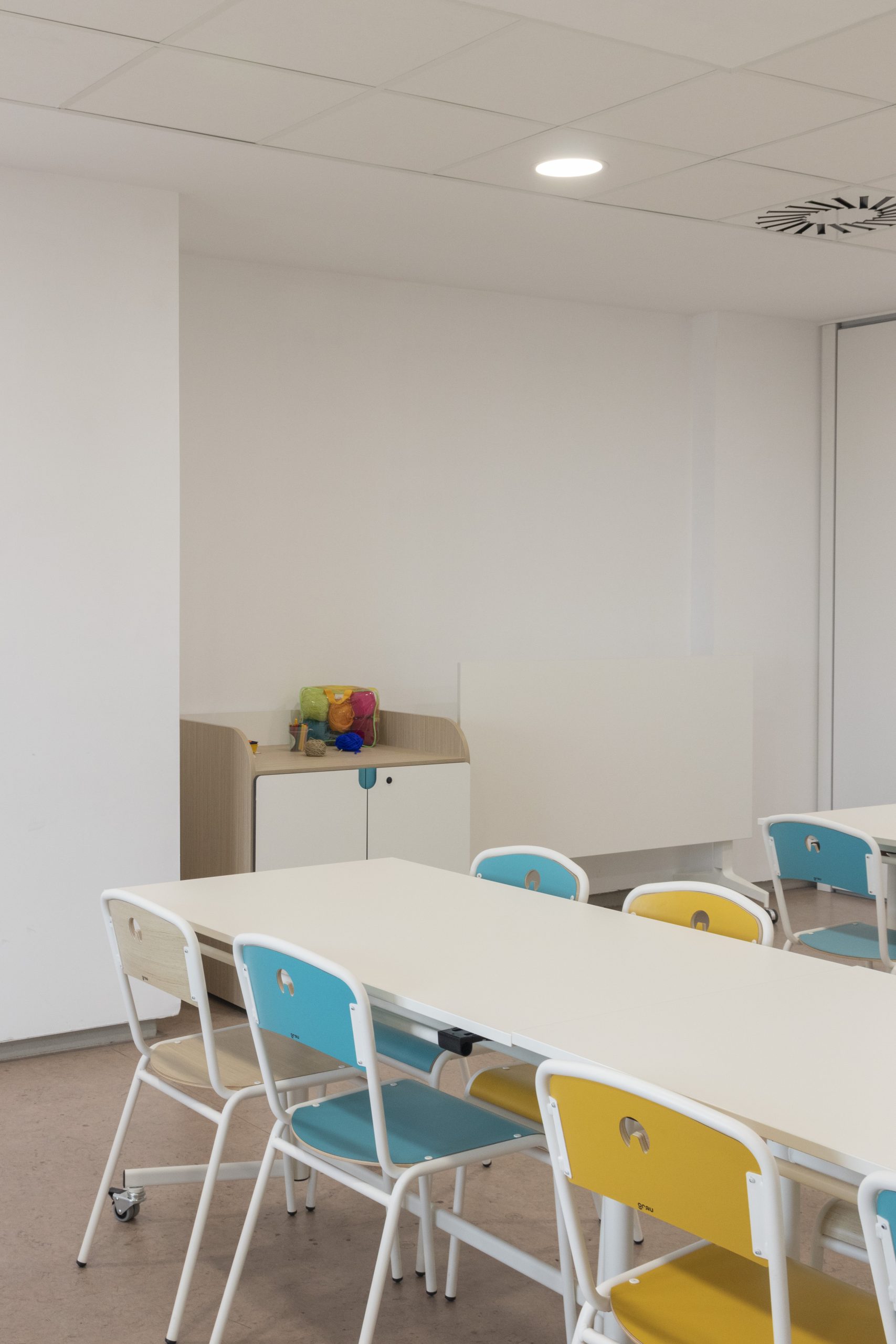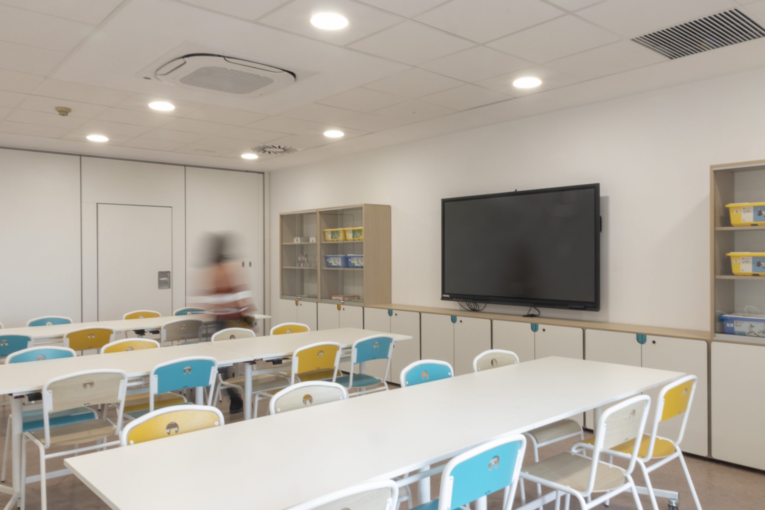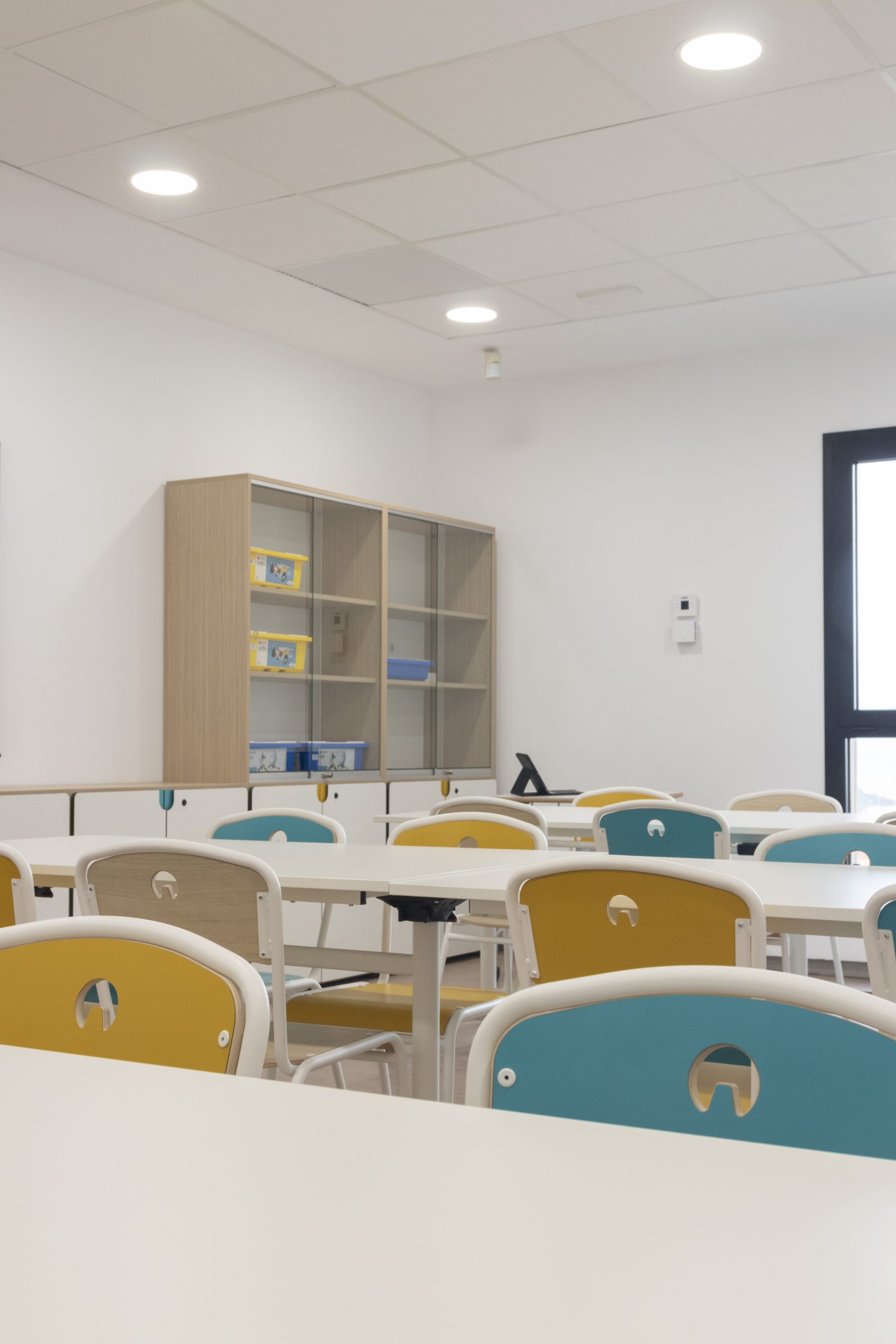 Tanto las mesas como el equipamiento han sido seleccionados por su movilidad, favoreciendo una gran versatilidad en la disposición del aula. De esta manera, el mismo espacio puede acoger actividades muy diversas: desde talleres de robótica y manualidades hasta sesiones formativas, trabajos en grupo o exposiciones.