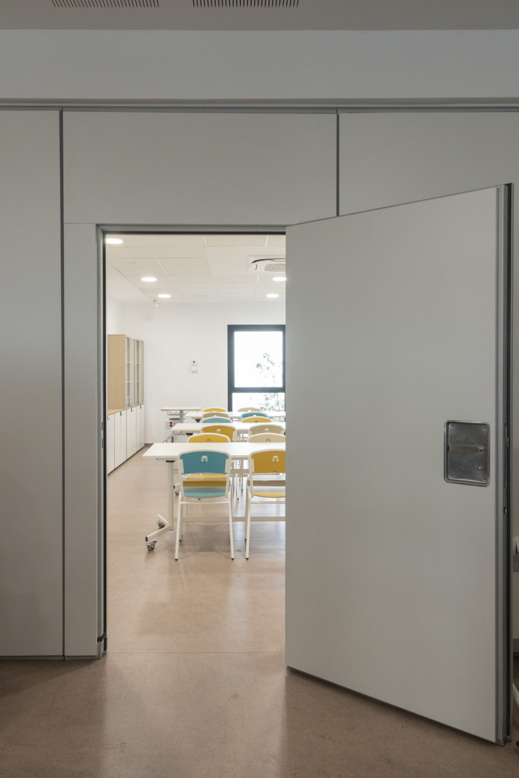 El aula STEAM se ha integrado dentro del espacio de la biblioteca a través de un tabique móvil con puerta batiente incorporada. Este sistema permite utilizar el aula como un espacio independiente cuando se requiere mayor privacidad o concentración, o bien abrirla completamente para que forme parte del conjunto de la biblioteca, reforzando así su carácter comunitario y abierto.