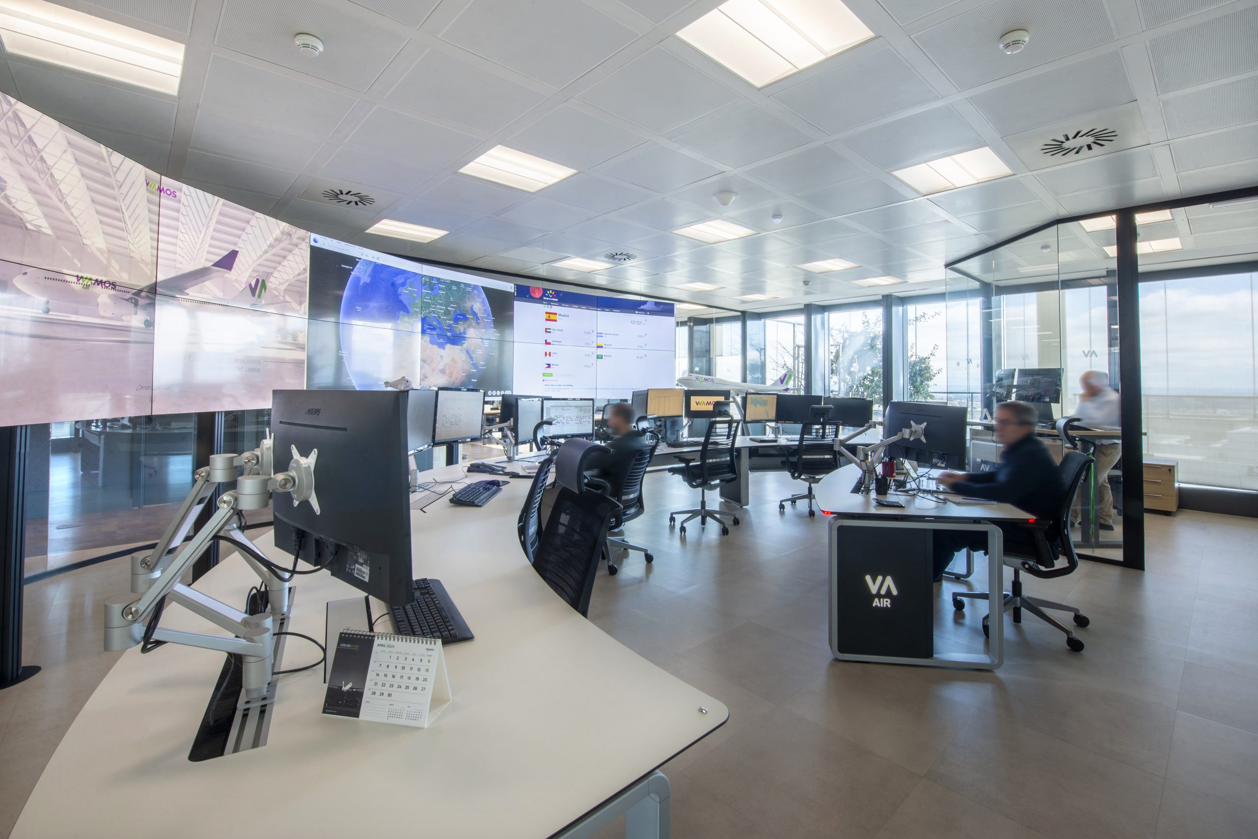 En esta fase reformamos la sala OCC (Operational Control Center), el auténtico cerebro de Wamos Air, que opera 24/7 y centraliza el control de todos los vuelos. Esta sala, antes poco funcional, se rediseñó con mesas ergonómicas antiestáticas, cableado de última generación y hasta tres monitores por puesto, todos conectados a una pantalla central. La disposición favorece la comunicación fluida entre el manager y su equipo, así como con las salas de control de tripulación y viajes.