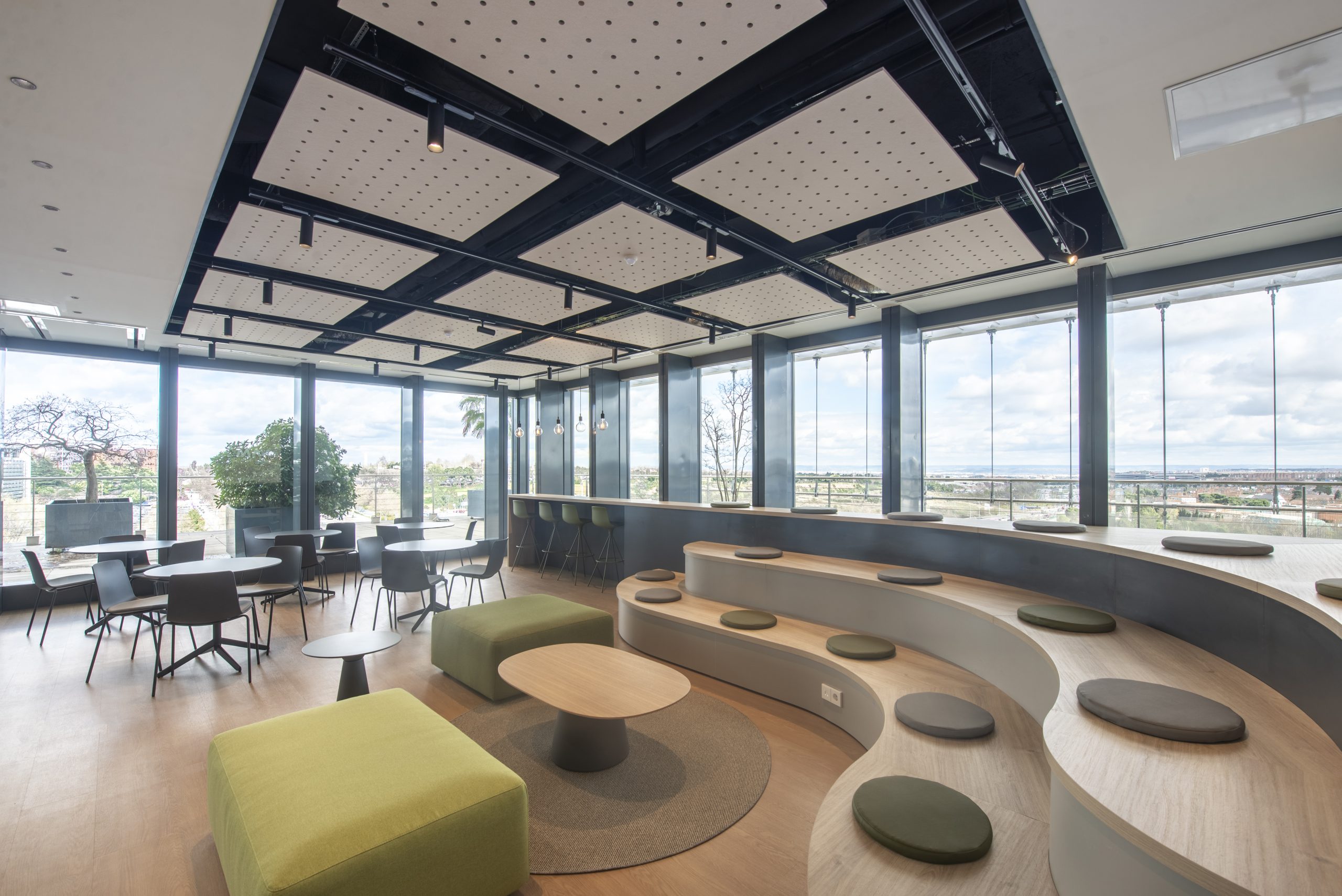 Uno de los principales retos era crear una nueva área de co-creación, un espacio polivalente pensado para formaciones, ruedas de prensa, shootings, consejos de administración y reuniones de alto nivel. Diseñamos una sala flexible, divisible en dos zonas mediante un tabique móvil: una con cocina integrada y otra con gradas, ideal para encuentros dinámicos y presentaciones. El techo ayuda a diferenciar visualmente cada zona según la actividad, reforzando la lectura espacial sin necesidad de compartimentar.