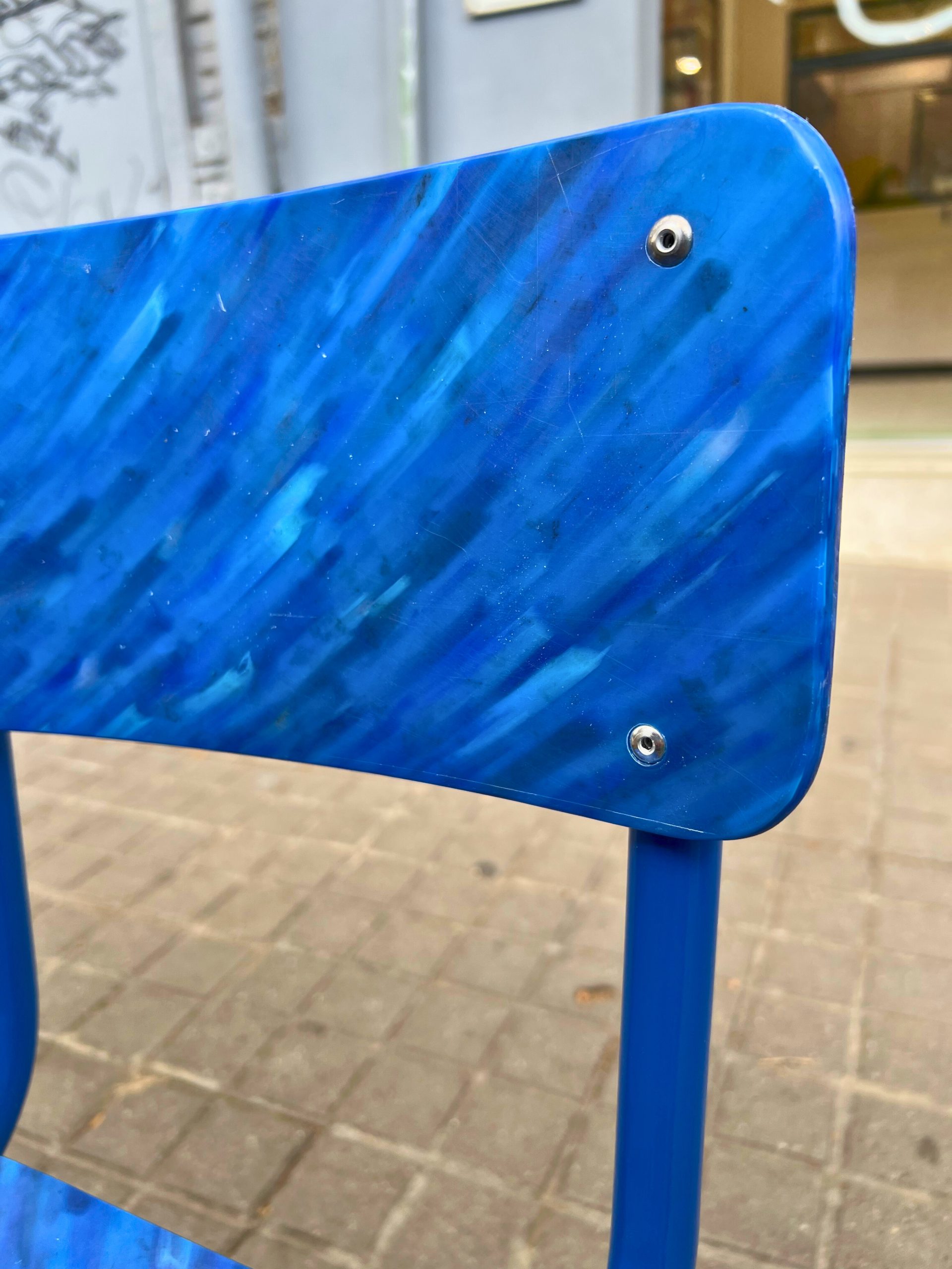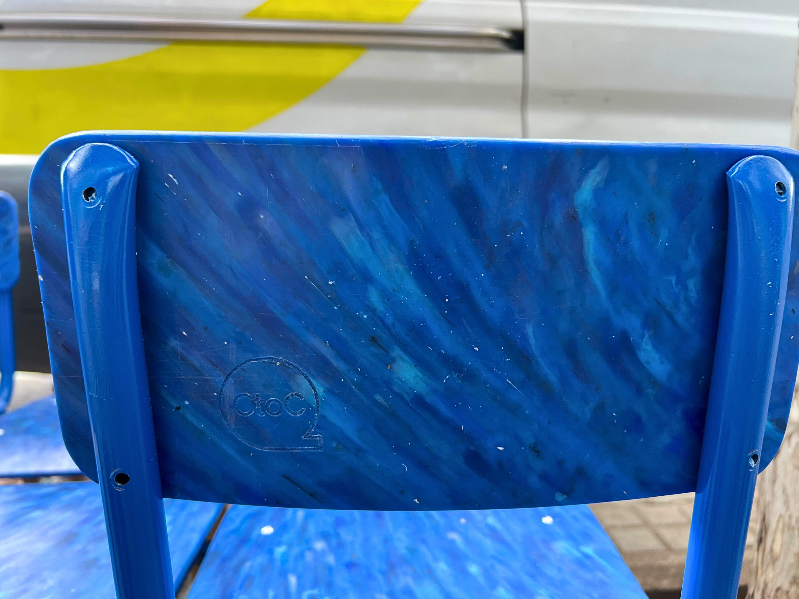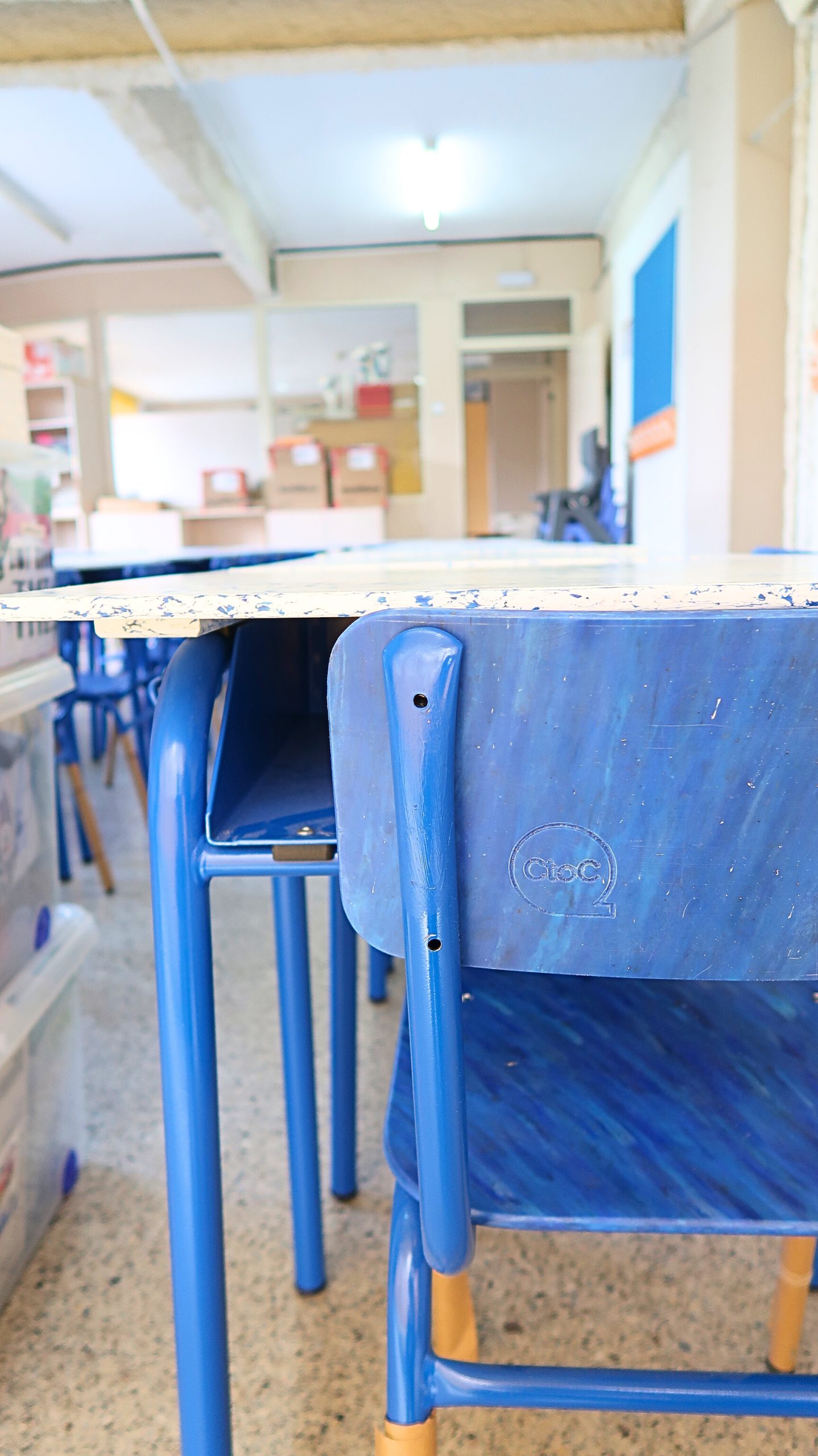 La renovació ha inclòs 25 pupitres i 25 cadires, dissenyats amb estructures metàl·liques pintades de blau i acabats amb plafons de plàstic reciclat: blau per a seients i respatllers, i blanc amb detalls blaus per a les taules. Un disseny funcional, atractiu i 100% alineat amb els valors de l’escola: respecte pel medi ambient, compromís social i aprenentatge col·laboratiu.
